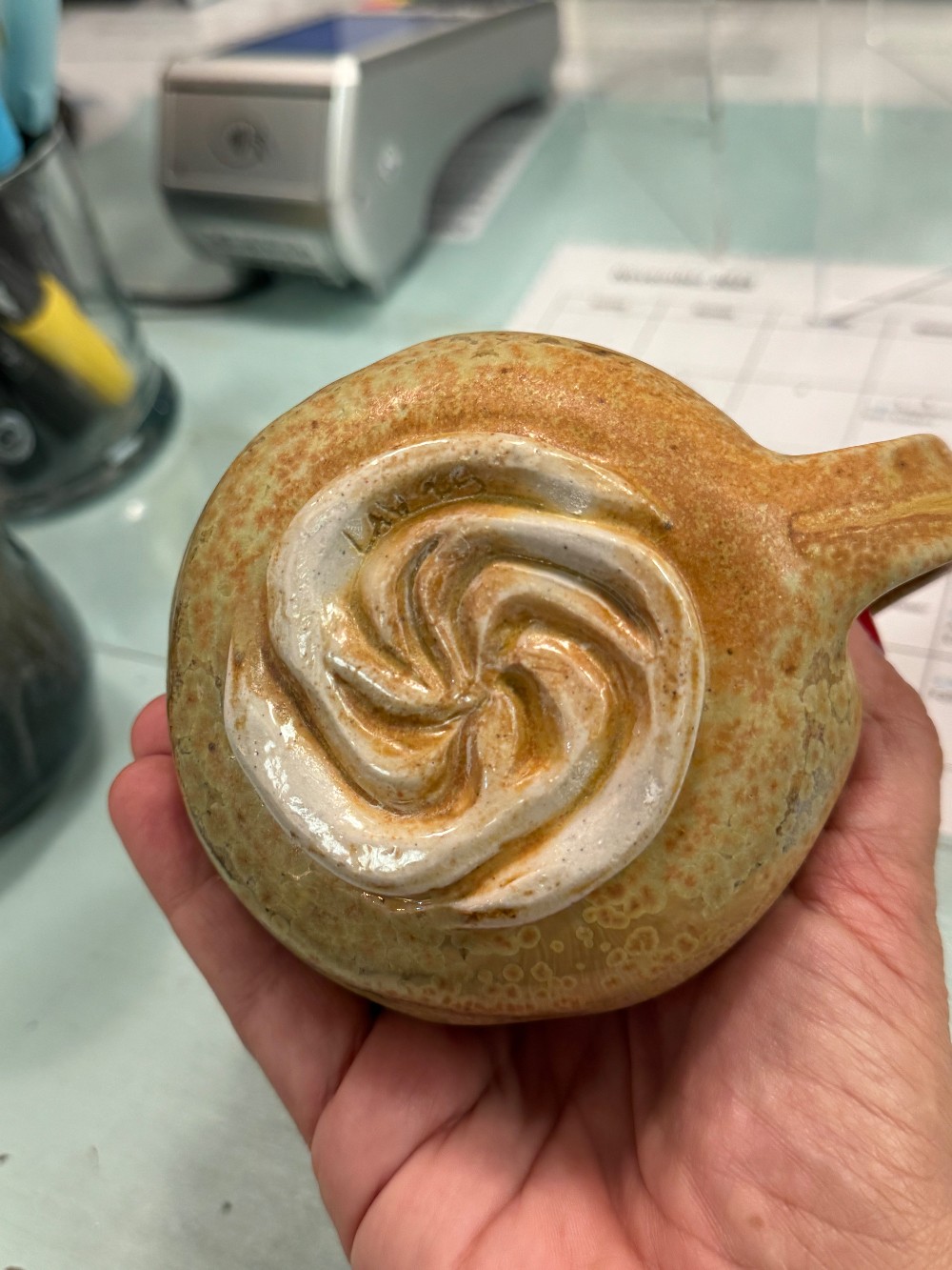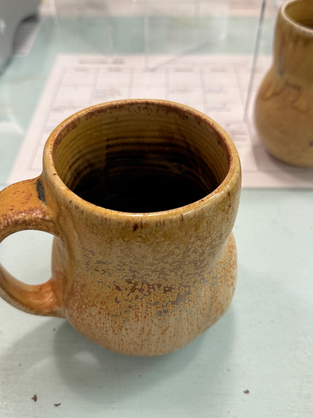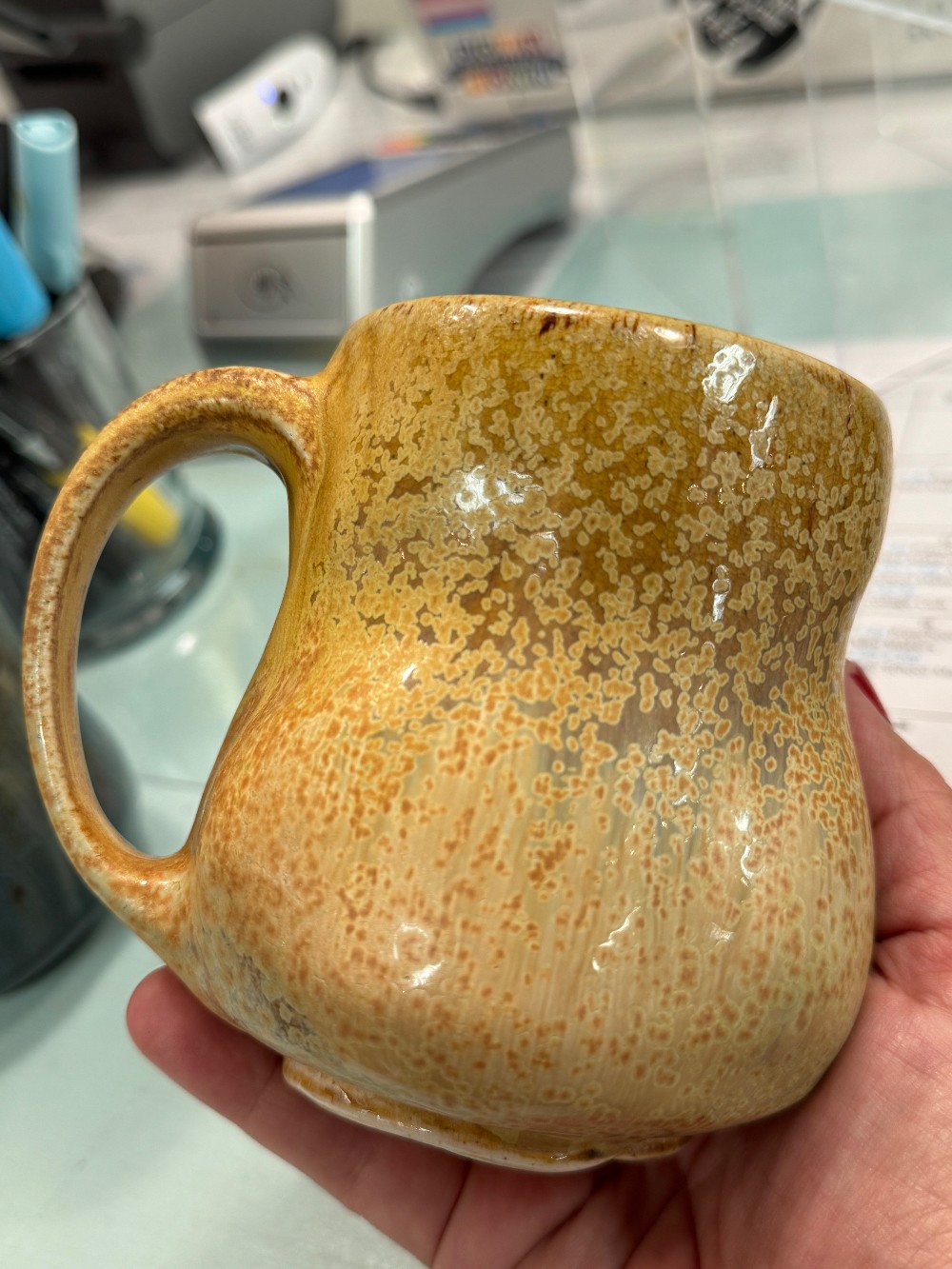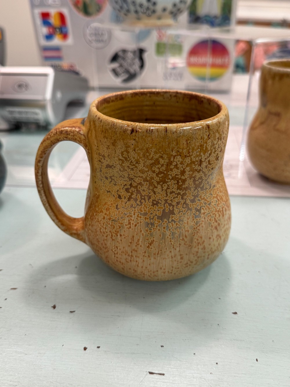 Stoneware, wheel-thrown then altered, salt-fired mug with crystals